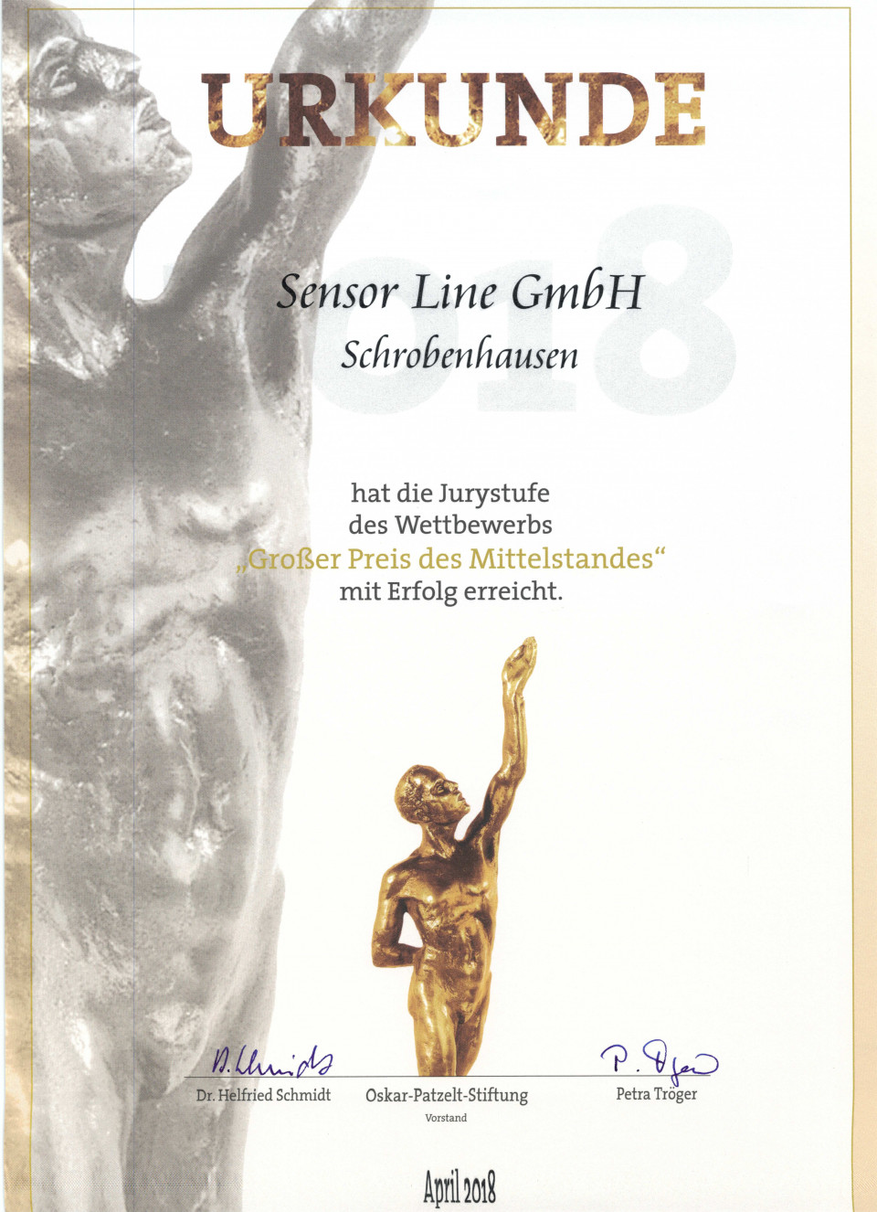 Sensor Line has been awarded with the Jury level of the Grand Prix of medium-sized Businesses („Großer Preis des Mittelstandes“) 2018.